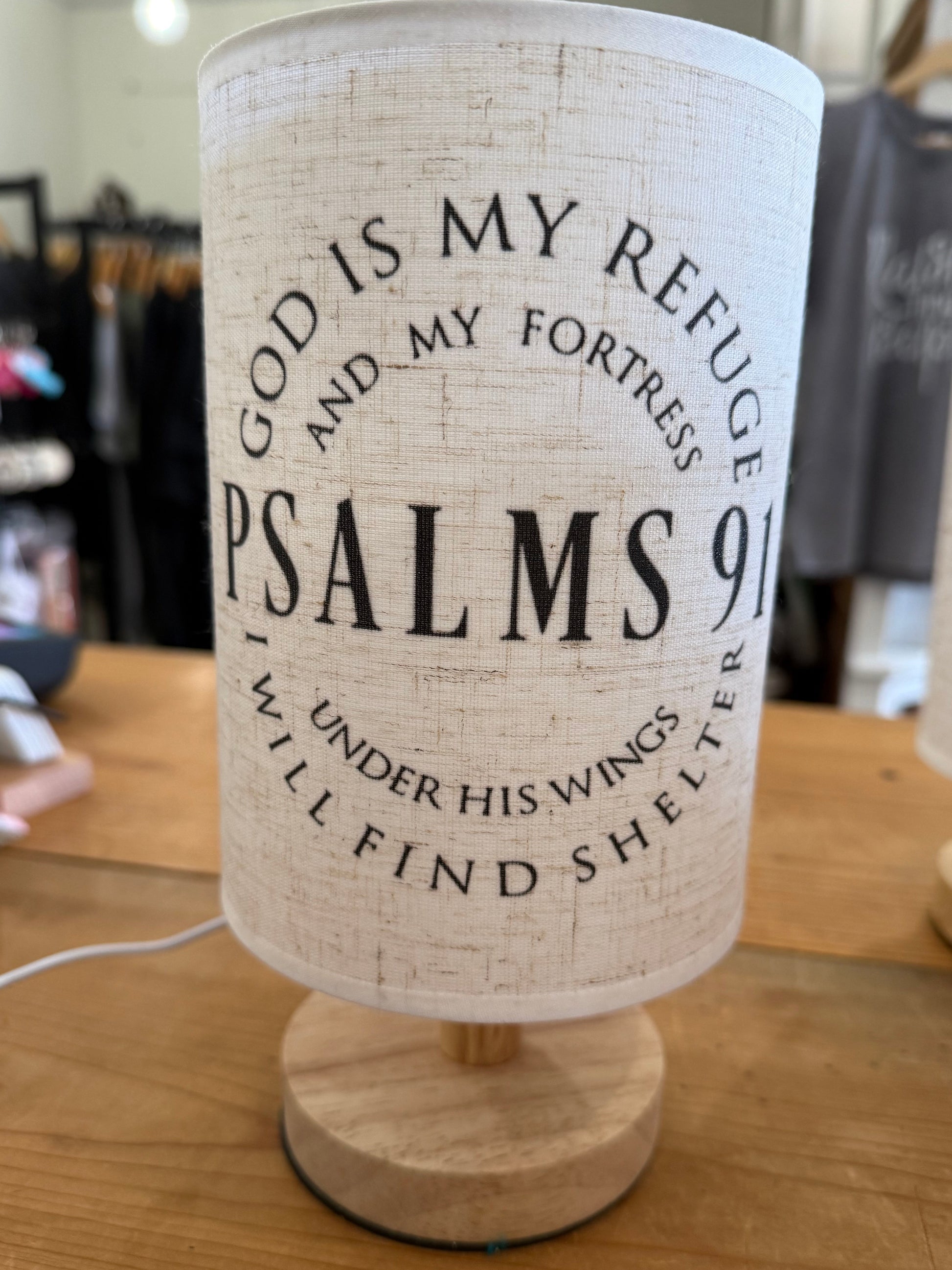 A comforting glow paired with one of Scripture’s most powerful promises, this Psalm 91 table lamp brings peace and protection into any room. The soft fabric shade features the reassuring words “God is my refuge and my fortress… Under His wings I will find shelter” arranged in a beautiful circular design. Set on a natural wooden base, it blends effortlessly into cozy, modern, or rustic décor.