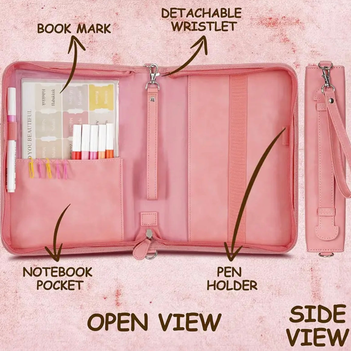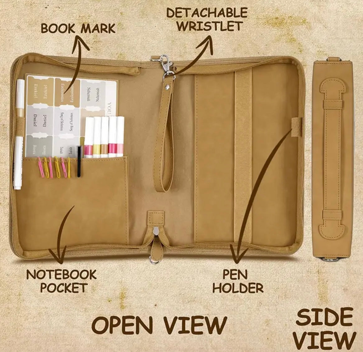 The durable, easy-to-clean material keeps your Bible safe from wear and tear, while the smooth zipper closure and convenient handle make it perfect for church, Bible study, or travel. Inside, you’ll find pockets and pen loops to keep your study essentials organized.